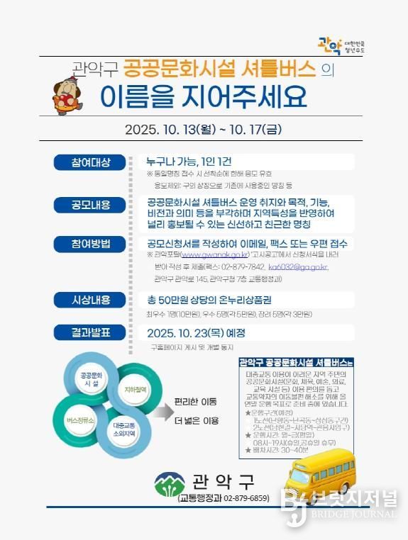 아울러 구는 오는 17일까지 공공문화시설 셔틀버스 명칭을 공모한다. 지역 제한없이 누구나 응모할 수 있으며 셔틀버스의 목적과 비전을 담아낸 이름을 지어 담당자 이메일또는 팩스로 제출하면 된다. 당선작은 10월 23일 개별 통지되고, 구청 홈페이지에도 게시될 예정이다.