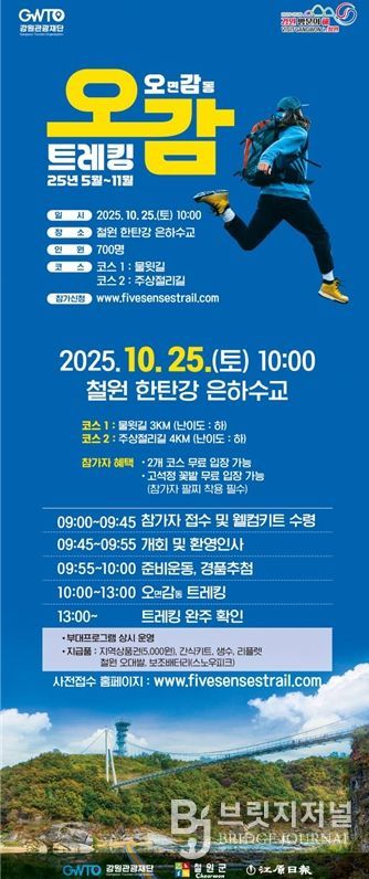 브릿지저널 윤나영 기자 | 강원관광재단은 강원 걷기 여행 활성화를 위해 추진 중인 ‘오감트레킹’행사를 10월 25일, 철원한탄강 은하수교 일원에서 700여 명의 참가자와 함께 개최한다고 밝혔다.
