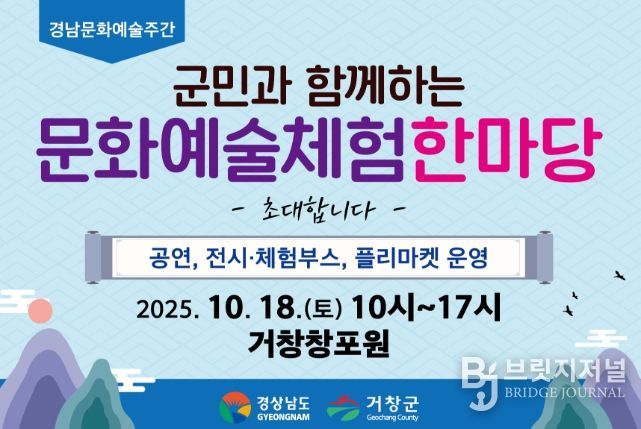 브릿지저널 김경미 기자 | 거창군은 오는 18일 거창의 대표 관광지인 거창창포원 일원에서 ‘2025 문화예술체험한마당’을 성대하게 개최한다.