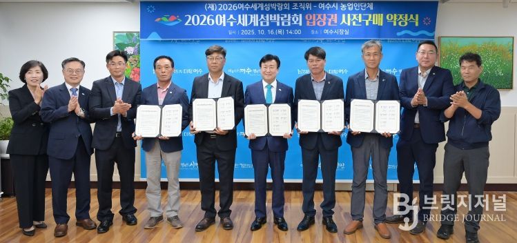 브릿지저널 김경미 기자 | (재)2026여수세계섬박람회조직위원회는 지난 16일 여수시청 시장실에서 여수 농업인 단체와 2026여수세계섬박람회 입장권 1,500만 원 규모의 사전 구매 약정을 체결했다고 밝혔다.