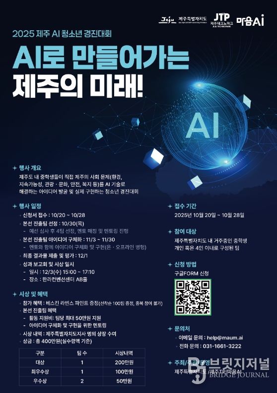 제주특별자치도와 제주테크노파크(원장 지영흔, 제주TP)는 도내 청소년의 AI 이해도 향상과 창의적 문제 해결 역량 강화를 위해 ‘2025 제주 AI 청소년 경진대회’ 참가자를 오는 28일까지 모집한다고 20일 밝혔다.