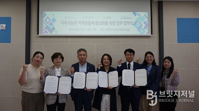 브릿지저널 정보영 기자 | 제주연구원(원장 유영봉) 제주사회복지연구센터(센터장 오윤정)는 2025년 10월 17일, 지속가능한 지역공동체 활성화를 위해 제주특별자치도 지속가능발전협의회, 일배움터, 제주특별자치도 마을만들기종합지원센터와 업무협약을 체결했다.