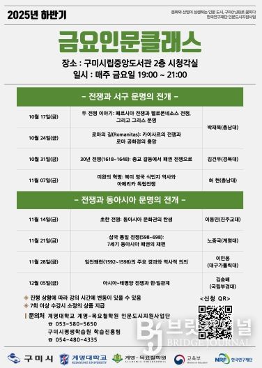 브릿지저널 정보영 기자 | 구미시에서는 지난 17일 오후 7시 구미시립중앙도서관 2층 시청각홀에서 '2025년 하반기 금요인문클래스'강좌를 개강했다.