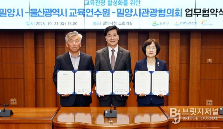 브릿지저널 윤나영 기자 | 울산교육연수원은 21일 밀양시청 소회의실에서 경남 밀양시, 밀양시관광협의회와 지역 자원을 활용한 현장 체험 연수 지원 등을 내용으로 하는 업무협약을 체결했다.