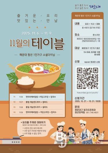 브릿지저널 윤나영 기자 | 해운대구는 11월 6~9일 청년 1인 가구를 위한 소셜다이닝 ‘11월의 테이블’을 연다.