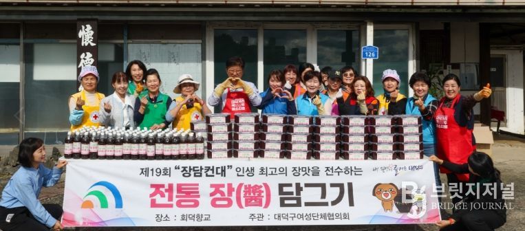 브릿지저널 정보영 기자 | 대전 대덕구 여성단체협의회(회장 이순화)는 22일 회덕향교에서 ‘전통 장(醬) 나눔 행사’를 열고 지역 내 홀몸 어르신, 한부모 가정, 다문화가정 등 60가구에 된장과 간장을 전달했다고 밝혔다.