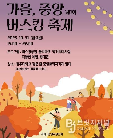 브릿지저널 김경미 기자 | 청주대중앙로상인연합회(회장 안재룡)는 오는 31일 오후 3시부터 10시까지 청주대 중앙로 먹자거리(파리바게트~왕뚝배기 한 블록)에서 ‘제1회 가을중앙버스킹축제’를 개최한다고 밝혔다.