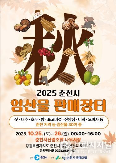 춘천시는 25~26일 이틀간 동면 만천리 산림조합 나무전시판매장에서 ‘2025 춘천시 가을철 임산물 판매장터’를 연다. 이 행사는 춘천시가 주최하고 춘천시산림조합이 주관해 임업인의 판로를 넓히고 시민들에게 신선하고 안전한 지역 임산물을 합리적인 가격에 제공하는 행사다.