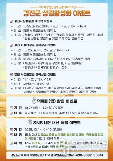 이번 이벤트는 상가 방문객 및 소비 촉진을 유도해 진읍 골목상권의 활력을 불어넣기 위해 진행되며, 주요 이벤트로는 강진사랑상품권 페이백 이벤트, 강진 서성다정길 골목상권 이벤트, 강진 서성도담길 골목상권 이벤트, ‘강진맛깨비’ 먹깨비 할인 이벤트, SNS 내돈내산 특별 이벤트 등이 있다.