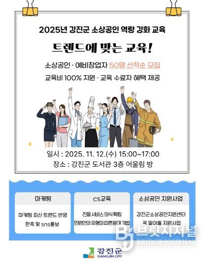브릿지저널 김경미 기자 | 강진군이 관내 소상공인과 예비창업자를 대상으로 매출 증대를 위한 실전 중심의 교육을 운영한다. 교육 신청은 오는 11월 7일까지 진행되며, 교육은 11월 12일 수요일 오후 3시부터 5시까지 강진군 도서관 3층에서 실시될 예정이다.