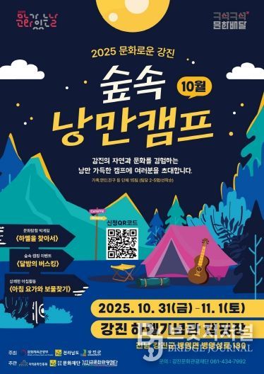 브릿지저널 김경미 기자 | 강진군과 강진군문화관광재단은 2025 문화가 있는 날–구석구석 문화배달 사업의 하나로 ‘캠핑과 함께하는 문화로운 강진’ 2차 행사를 오는 10월 31일부터 11월 1일까지 병영면 하멜 감성텐트촌에서 갖는다.
