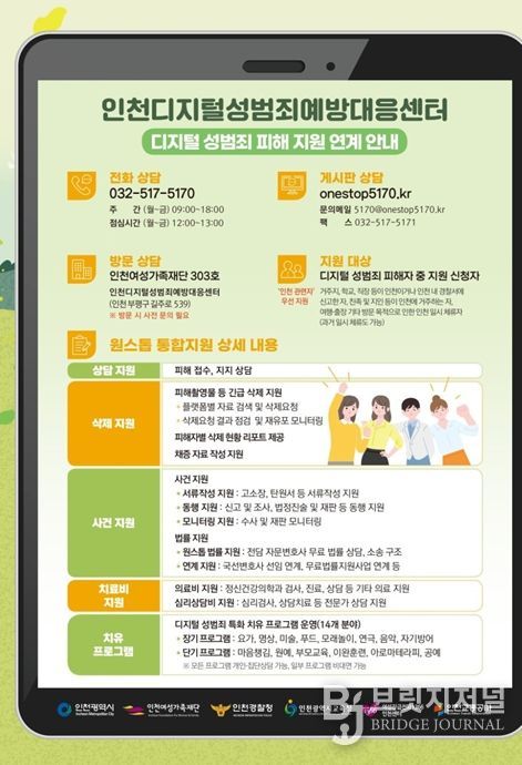 브릿지저널 김경미 기자 | 인천디지털성범죄예방대응센터는 디지털 성범죄 피해자에 대한 ▲상담 지원 ▲삭제 지원 ▲사건 지원 ▲치료비 지원 ▲특화 치유 프로그램 운영 등 디지털 성범죄 피해자의 상담부터 피해 회복까지 원스톱 통합지원을 실시하는 기관으로, 2021년 6월 14일 인천광역시가 인천여성가족재단에 설치하여 운영하고 있다.