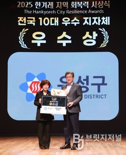 브릿지저널 정보영 기자 | 대전 유성구가 지난 23일 서울 중구 대한상공회의소 국제회의장에서 열린 '2025 한겨레 지역 회복력 평가' 시상식에서 전국 10대 우수 지방자치단체에 선정됐다.