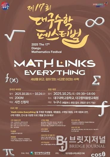 브릿지저널 김진석 기자 | 대구시교육청이 주최하고 대구중등수학교육연구회가 운영하는 ‘제17회 대구수학페스티벌’이 10월 25일 9시 30분부터 대구과학고 및 대구창의융합교육원에서 'Math Links Everything(수학은 모든 것을 연결한다)'이라는 주제로 개최된다.