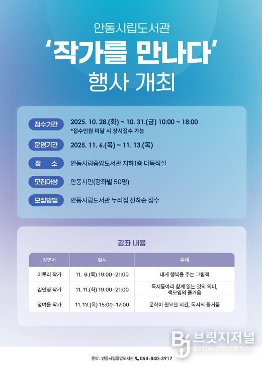 브릿지저널 정보영 기자 | 안동시립도서관은 오는 11월 6일부터 13일까지 안동시립중앙도서관에서 3회에 걸쳐 3명의 전문 작가를 초청하는 ‘작가를 만나다’ 특강을 운영한다.