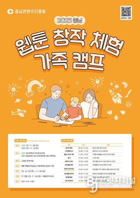 브릿지저널 정보영 기자 | 충남콘텐츠진흥원은 충남의 웹툰 문화 활성화와 가족이 함께하는 창의적 웹툰 문화체험을 제공하기 위해 ‘2025 충남 웹툰 창작체험 가족 캠프’를 개최한다.