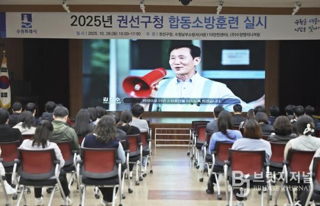 브릿지저널 김경미 기자 | 수원시 권선구는 지난 28일 수원남부소방서(서둔119안전센터)와 권선구 직원들과 함께 공공기관 합동소방훈련을 실시했다.