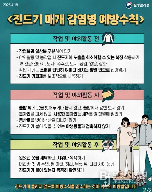 보건소 관계자는 “진드기에 물리지 않는 것이 감염병을 예방하는 가장 확실한 방법”이라며, “추수철과 단풍철 등 야외활동이 잦은 시기인 만큼 예방수칙을 철저히 지키고, 증상이 나타나면 지체 없이 진료를 받아야 한다”고 말했다.