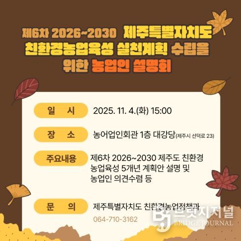 브릿지저널 정보영 기자 | 제주특별자치도가 향후 5년간 제주 친환경농업의 발전 방향을 담은 ‘제6차 친환경농업육성 실천계획(2026~2030)’ 수립을 위해 농업 현장의 목소리를 직접 듣는다.