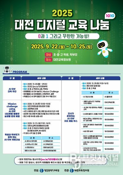 브릿지저널 정보영 기자 | 대전교육정보원은 ‘0과 1 그리고 무한한 가능성’을 주제로 ‘2025년 대전 디지털 교육 나눔1010’ 행사를 9월 22일부터 10월 28일까지 5주간 초·중·고 학생, 교원, 학부모를 대상으로 다채로운 온·오프라인 프로그램을 기획하여 성황리에 운영했다고 밝혔다.