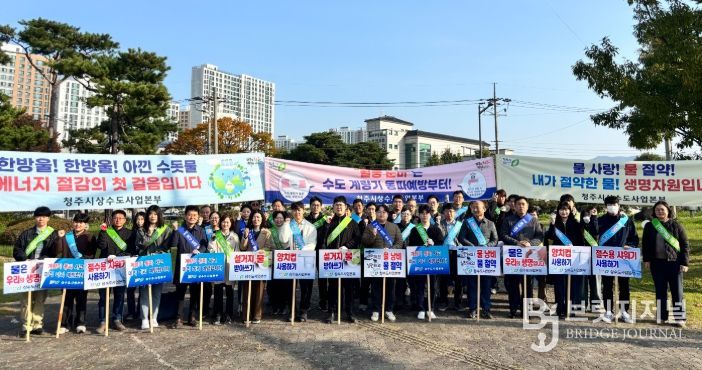 브릿지저널 김경미 기자 | 청주시 상수도사업본부는 30일 상당구 지북사거리에서 직원 60여명이 참석한 가운데 탄소중립 및 물 절약 실천 캠페인을 실시했다.