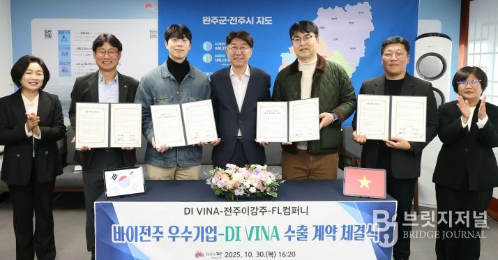 시는 30일 전주시장실에서 우범기 전주시장과 김완엽 DI VINA 대표, 바이전주 우수기업 대표 등이 참석한 가운데 ‘바이전주 우수업체-DI VINA 수출계약 체결식’을 가졌다.