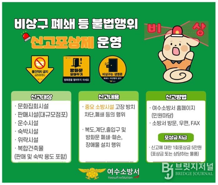 브릿지저널 김경미 기자 | 여수소방서(서장 서승호)는 소방시설 및 피난·방화시설의 불법행위를 시민이 직접 신고하면 포상금을 지급하는'소방시설 등 불법행위 신고포상제'를 적극 홍보 중이라고 30일 밝혔다.