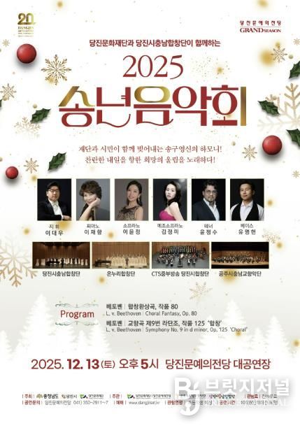 브릿지저널 정보영 기자 | (재)당진문화재단·당진문예의전당은 오는 12월 13일 토요일 오후 5시, 당진문예의전당 대공연장에서 '2025 송년음악회'를 개최한다. 이번 공연은 충청남도와 당진시, 당진문화재단이 주최하고, 당진문화재단·당진문예의전당, 공주시충남교향악단, 당진시충남합창단이 공동주관한다.