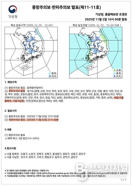 브릿지저널 김경미 기자 | 2일 밤 9시를 기점으로 서울 동북권 및 서남권 지역에 한파주의보가 발효됨에 따라 서울시는 한파 종합지원상황실을 즉시 가동하고 자치구 및 유관기관과 협력해 시민 보호, 취약시설 안전관리를 강화한다고 밝혔다.