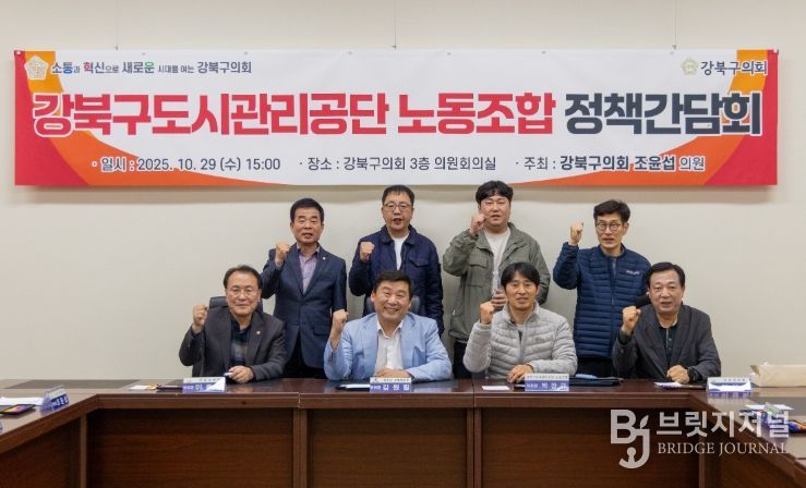 브릿지저널 김경미 기자 | 서울 강북구의회 조윤섭 의원(수유1동, 우이동, 인수동)은 지난 10월 29일 강북구의회 의원회의실에서 민주노총 전국민주일반노동조합 강북구도시관리공단지회 임직원들과 함께 ‘강북구도시관리공단 노동조합 정책간담회’를 개최했다.