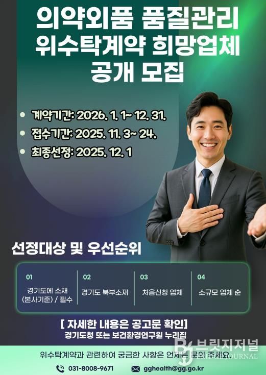브릿지저널 김경미 기자 | 경기도보건환경연구원은 오는 24일까지 ‘2026년 의약외품 품질검사 위·수탁계약’ 참여를 희망하는 제조·수입업체를 모집한다.