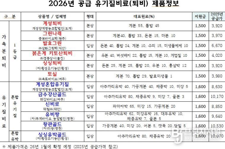 지원 품목은 유기질비료(가축분퇴비/1등급) 포당 1,500원, 유기질비료(혼합유기질) 포당 1,600원 으로 구매보조금이 정액 지원된다.