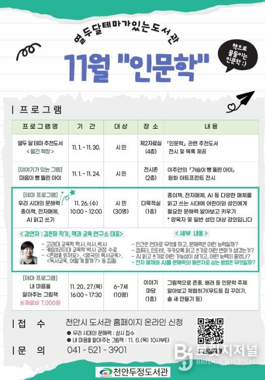 브릿지저널 정보영 기자 | 천안시 두정도서관은 11월 한 달간 ‘인문학’을 테마로 도서관을 운영한다고 3일 밝혔다.
