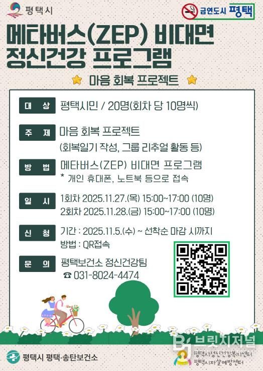 브릿지저널 김경미 기자 | 평택시는 시민들의 회복 탄력성 증진에 도움을 주고자 메타버스 플랫폼을 활용한 비대면 정신건강 프로그램 ‘마음 회복 프로젝트’를 운영한다.