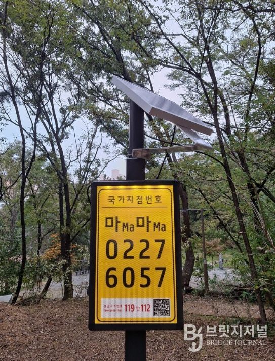 국가지점번호판은 국토 및 해양을 10m 단위 격자형으로 나누어 부여한 국가지점번호를 현장에서 쉽게 식별할 수 있도록 제작된 위치표시 표지판으로, 도로명주소가 없는 산악·하천 지역에서도 긴급상황 발생 시 구조기관의 신속한 위치 확인과 대응을 지원하는 안전 기반 시설물이다.