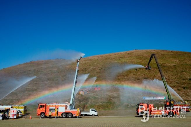 브릿지저널 정보영 기자 | 제주특별자치도 소방안전본부는 3일 새별오름 일대에서 60명의 인원과 소방헬기를 포함한 13대의 장비를 동원해 유관기관 합동 산불 대응훈련을 실시했다.