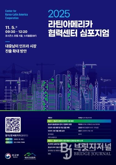 브릿지저널 김경미 기자 | 외교부는 11월 5일 서울 광화문 포시즌스 호텔에서 '2025 라틴아메리카 협력센터 심포지엄'을 개최한다. 올해로 17회째를 맞는 동 심포지엄은 라틴아메리카 협력센터의 연례 사업으로, 중남미 시장 동향과 진출 정보를 공유하고, 중남미 진출을 희망하는 우리국민들에게 네트워크의 장을 마련해왔다.