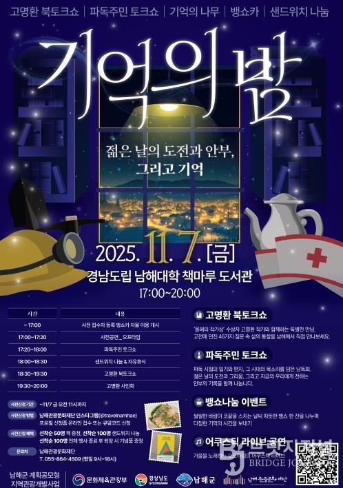 브릿지저널 김경미 기자 | ‘젊은 날의 도전과 안부, 그리고 기억’이라는 주제로 독일마을 기억의 밤 행사가 오는 11월 7일 17시부터 경남도립남해대학 책마루도서관에서 열린다.