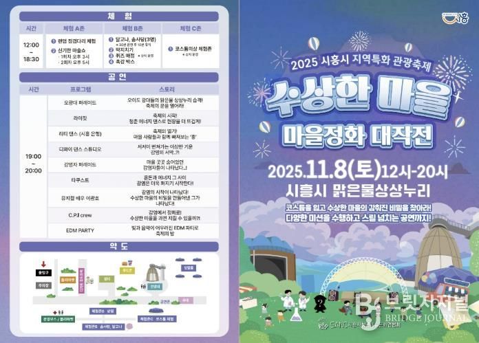 브릿지저널 김경미 기자 | 시흥시는 2025년 시흥시 지역특화 관광축제 지원사업 선정 축제인 ‘수상한 마을 마을정화대작전’을 오는 11월 8일 정왕동 맑은물상상누리 일원에서 개최한다. 이번 축제는 시흥시 청년예술연합회가 주관한다.