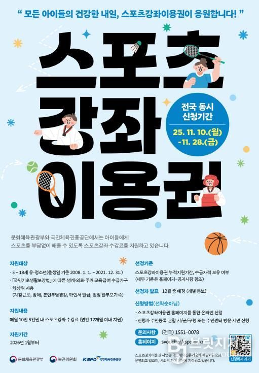 유·청소년 스포츠강좌이용권 지원 대상은 국민기초생활보장법에 따른 생계·의료·주거·교육 급여 수급 가구를 비롯해 차상위 계층, 법정 한부모가구의 만 5~18세 유·청소년이며, 스포츠강좌이용권 홈페이지 또는 관할 읍면동 행정복지센터에서 신청하면 된다.