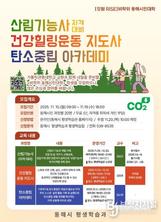 브릿지저널 윤나영 기자 | 동해시는 시민의 평생학습 역량 강화를 위해 '비학위 동해시민대학' 전문과정으로 ▲산림기능사(자격대비) ▲건강힐링운동 지도사 ▲탄소중립 아카데미 3개 과정을 개설하고, 오는 11월 19일까지 동해시 평생학습관 홈페이지를 통해 수강생을 모집한다.