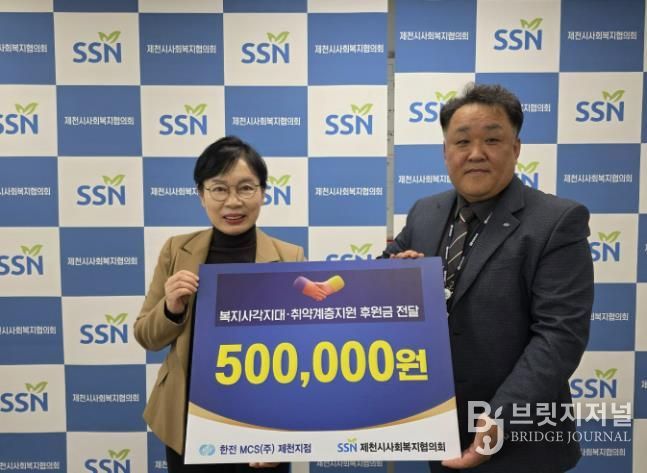 브릿지저널 김경미 기자 | 한전MCS(주)제천지점은 지난 6일 겨울철을 맞아 복지소외계층을 위한 후원금을 제천시사회복지협의회(회장 양순경)에 전달했다.