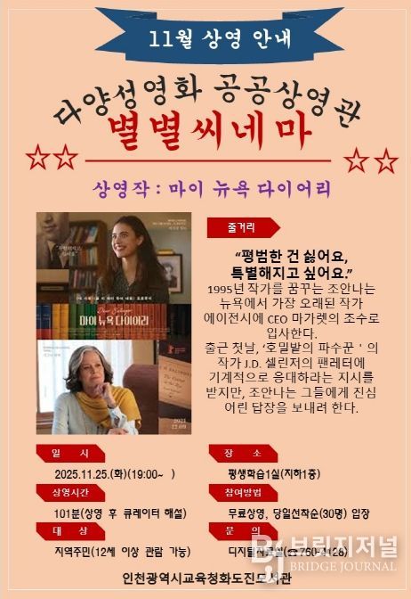 브릿지저널 김경미 기자 | 인천광역시교육청화도진도서관은 시민들의 영상문화 향유 기회를 확대하고자 운영 중인 다양성영화 공공상영관 ‘별별씨네마’를 오는 11월 25일 오후 7시, 화도진도서관 평생학습1실에서 진행한다고 밝혔다.