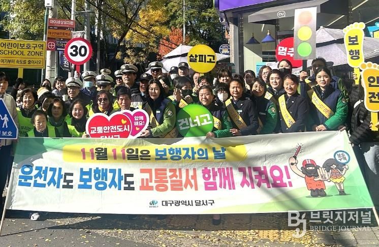 브릿지저널 김진석 기자 | 대구 달서구는 ‘2025년 보행자의 날(11월 11일)’을 맞아 11월 10일 성서노인종합복지관 앞 삼거리(노인보호구역)에서 ‘보행안전 릴레이 캠페인(신호등 퍼포먼스)’을 개최했다.