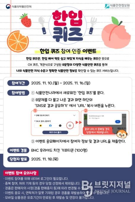 브릿지저널 김경미 기자 | 식품의약품안전처와 식품안전정보원은 국민이 식품 안전 정보를 쉽고 재밌게 알 수 있도록 식품안전나라의 퀴즈 서비스인 ‘한입 퀴즈’를 11월 10일부터 제공한다고 밝혔다.