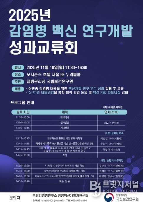 브릿지저널 김경미 기자 | 질병관리청 국립보건연구원은 11월 10일 서울 포시즌스 호텔(서울 종로구)에서 '2025년 감염병 백신 연구개발 성과교류회'를 개최한다.