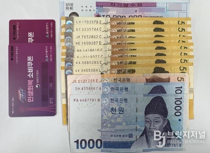 "사용하지 않은 민생회복 소비쿠폰"이라며 내놓은 18만원권과 10만원권 카드 각 1장과 10,000,000원권 수표 1장, 5만원권 8장, 5천원권 1장, 1천원권 2장 등 현금이었다.