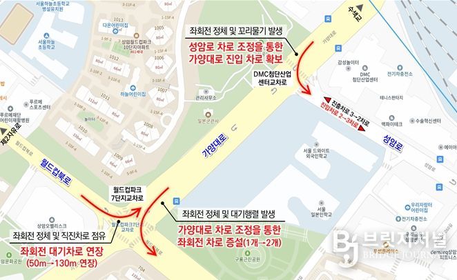 브릿지저널 김경미 기자 | 교차로 꼬리물기와 정체가 반복됐던 가양대로(월드컵파크7단지 교차로 ~DMC첨단산업센터 교차로)에 좌회전 차로가 추가되고, 교통량이 많아 좌회전 대기차량이 직진차로까지 점유했던 올림픽선수기자촌아파트 교차로·중앙대병원입구 교차로는 대기차로 연장을 늘린다. 또 중계역 교차로·서빙고동주민센터 교차로 등 도로 기하구조도 개선된다.
