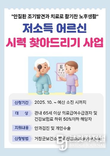 브릿지저널 김경미 기자 | 거창군은 고향사랑기부제 지정기부사업으로 추진 중인 ‘저소득 어르신들의 시력 찾아드리기 사업’이 10월 시작 이후 꾸준히 이어지며, 시력 회복 지원을 받은 어르신들로부터 큰 호응을 얻고 있다고 11일 밝혔다.