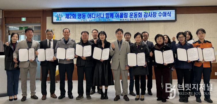 브릿지저널 김경미 기자 | 충청북도영동교육지원청은 11일 교육지원청 2층 대회의실에서 ‘제2회 영동 '어디서나 함께' 어울림 운동회’의 성공적 개최에 기여한 지역사회 유공 민간인 및 단체에 감사의 마음을 전하는 자리를 가졌다.